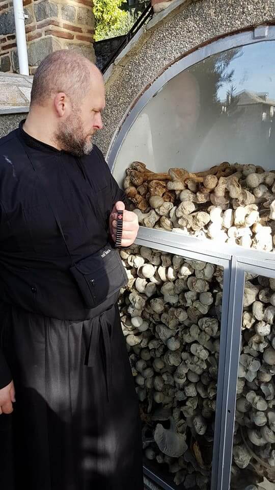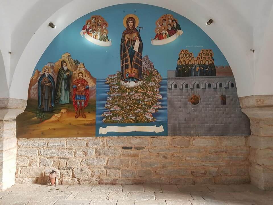 В монастыре хранятся: частица Животворящего Креста Господня, и глава свщм. Дионисия Ареопагита, первого епископа Афинского (I век),глава св. Митрофана патриарха Константинопольского (IV век), плат с кровью вмч. Димитрия Солунского, и глава новомуч. Георгия Ефесского, и рука мч. Марины, пмч. Параскевы, частицы мощей св. Иоанна Крестителя, вмч. Пантелеимона, свщм. Ермолая, свщм. Харалампия, св. Иоанна Русского, вмч. Никиты и другие.